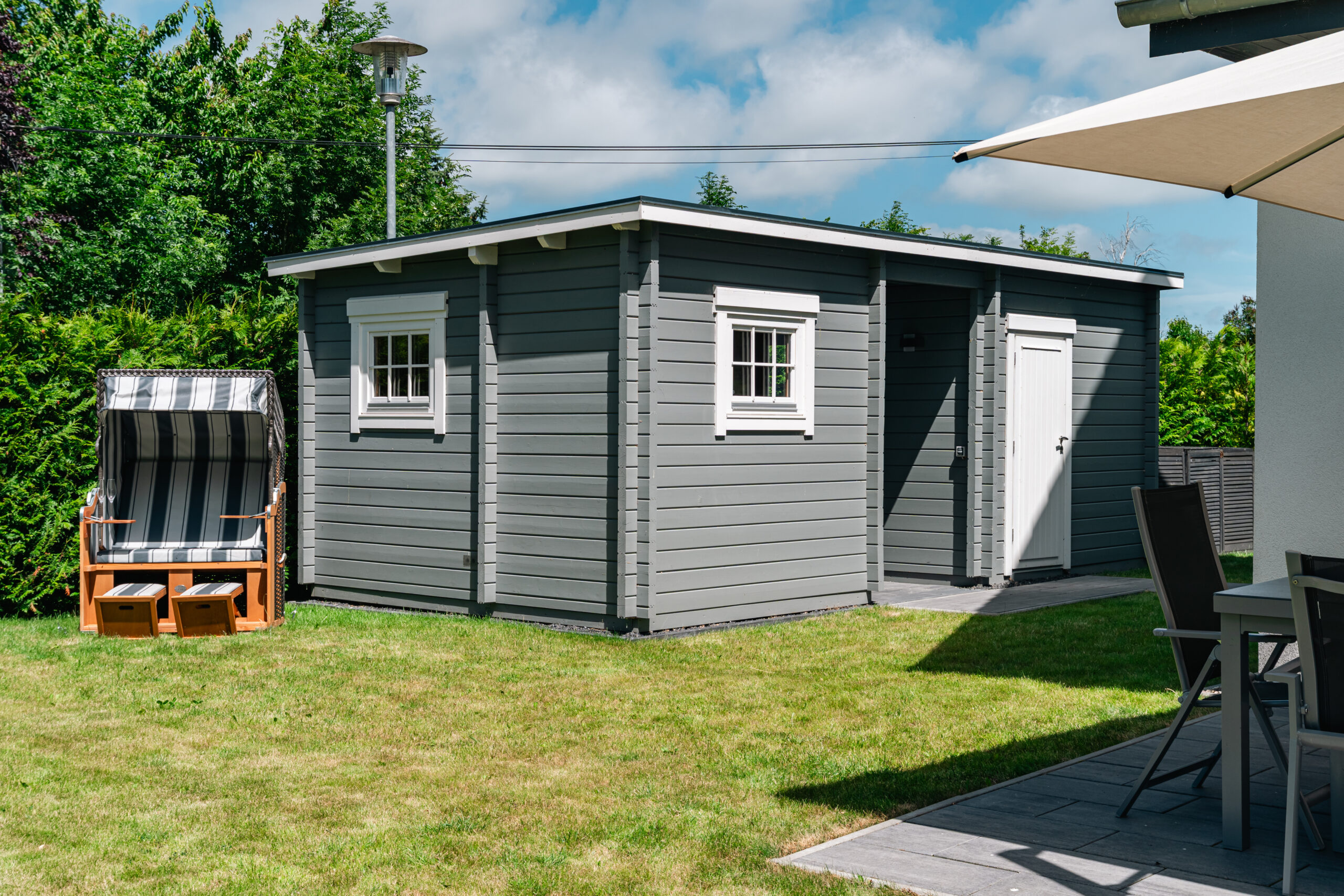 Die Außendusche im Garten ist von ca. Anfang November – ca. Ende März wegen Frostgefahr nicht nutzbar. Alternativ gibt es einen Gartenschlauch, der an den Außenwasserhahn angeschlossen werden kann.